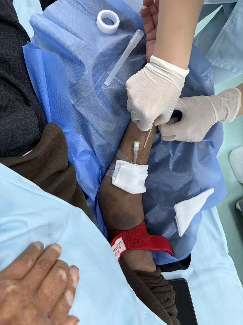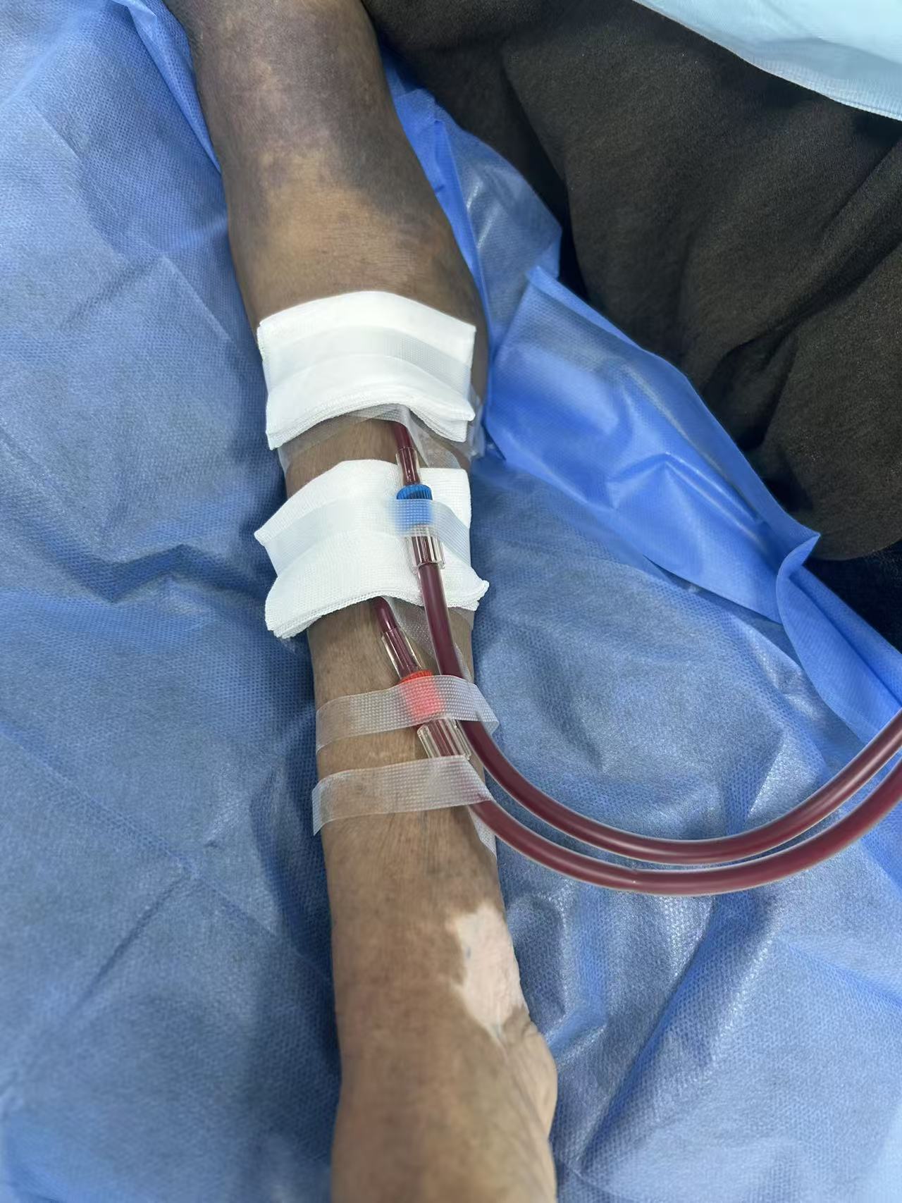 患者陈某某,76岁,自2025年7月起使用动静脉内瘘作为长期血管通路在我院进行透析治疗。治疗过程中,由于患者年事已高,自主翻身活动时传统穿刺针容易移位,不仅可能导致血管损伤形成血肿,穿刺点周围皮肤也长期处于淤青状态。